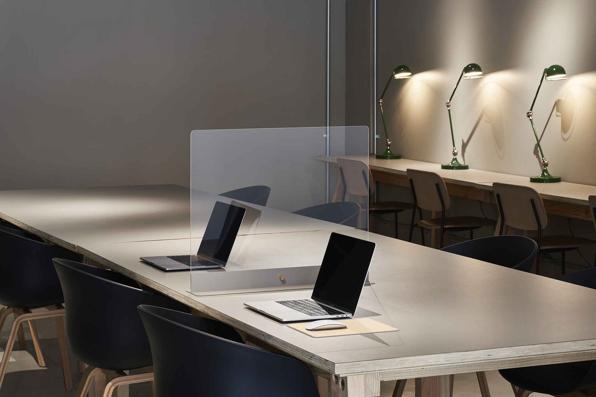 スライドすることで隣同士の席にも対応する飛沫防止パーテーションのデザイン。
